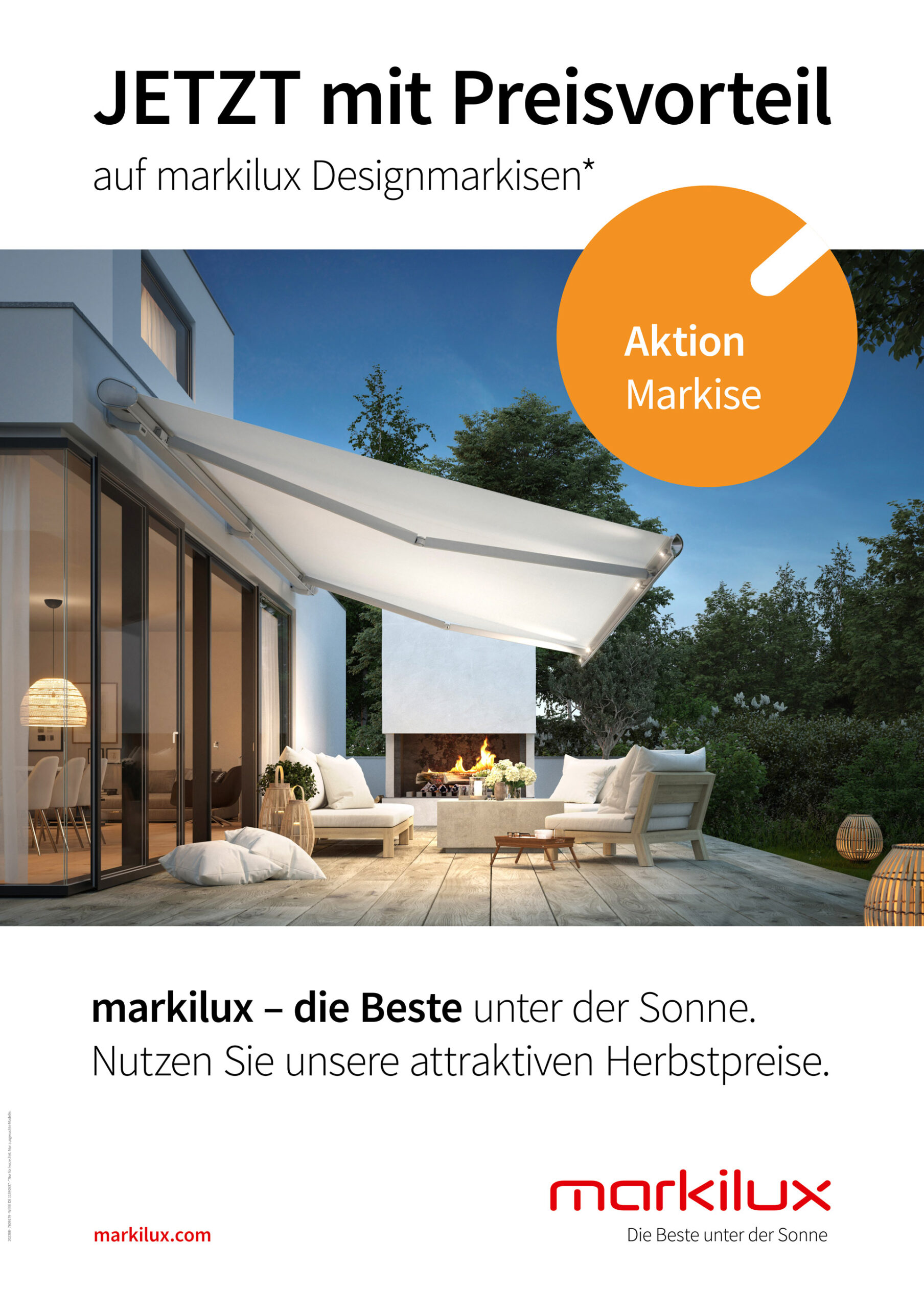 Nutzen Sie unsere Spätsommeraktion mit einem Rabatt von 10 % auf die attraktiven Kassettenmarkisen und Pergola-Classic-Produkte von Markilux. Verschönern Sie Ihren Outdoorbereich und sichern Sie sich im Aktionszeitraum vom 01.09. bis zum 31.10.