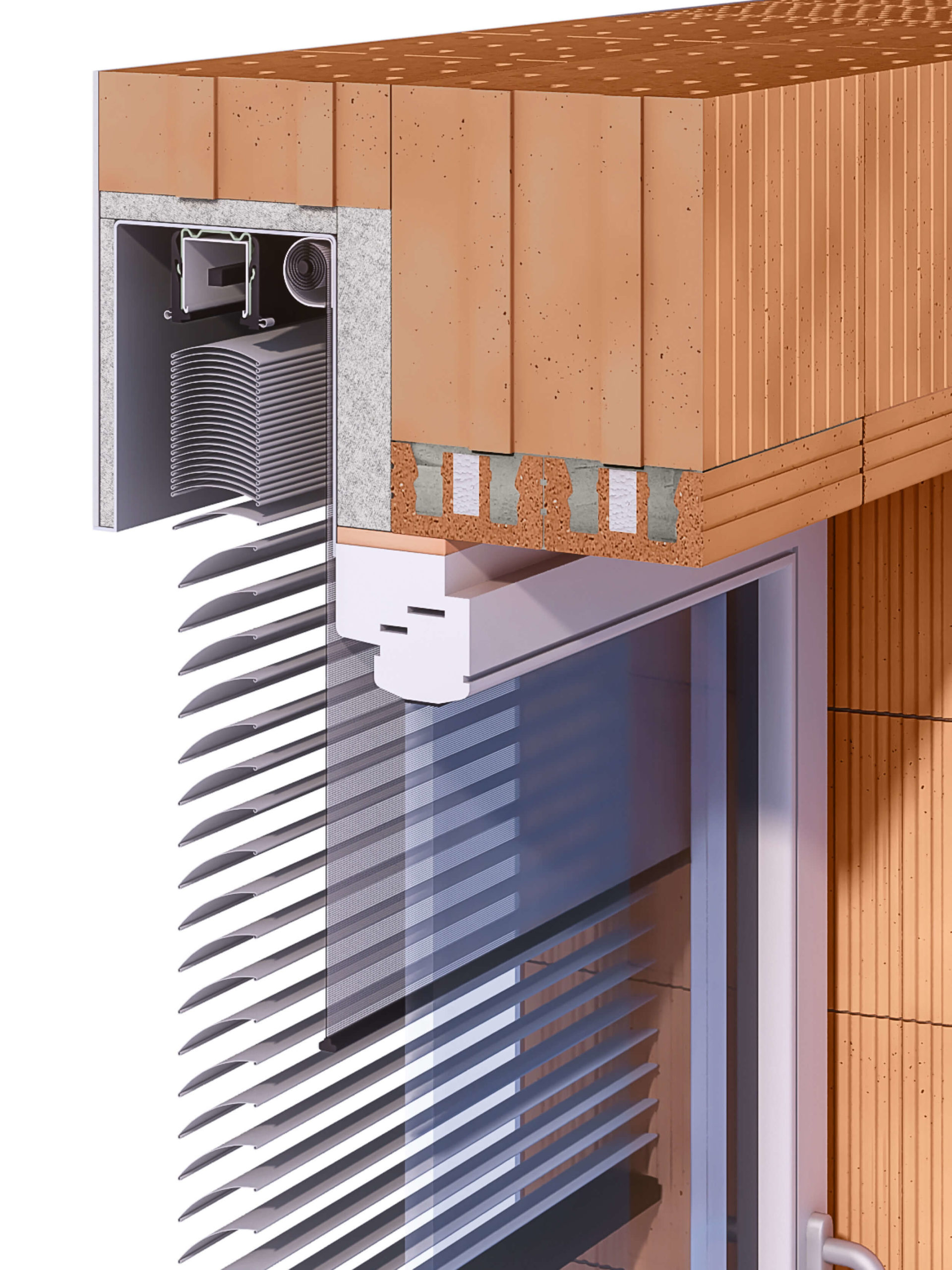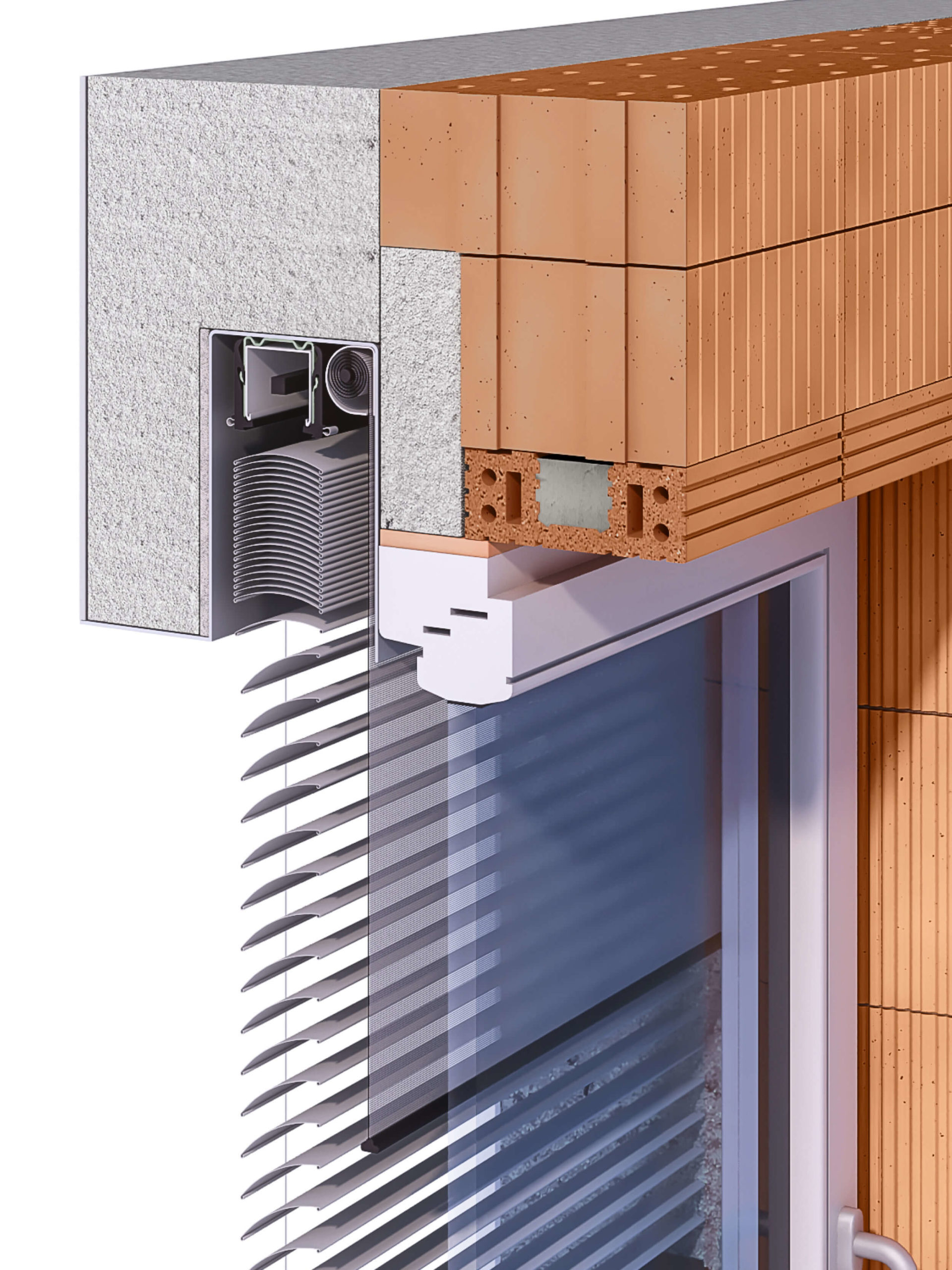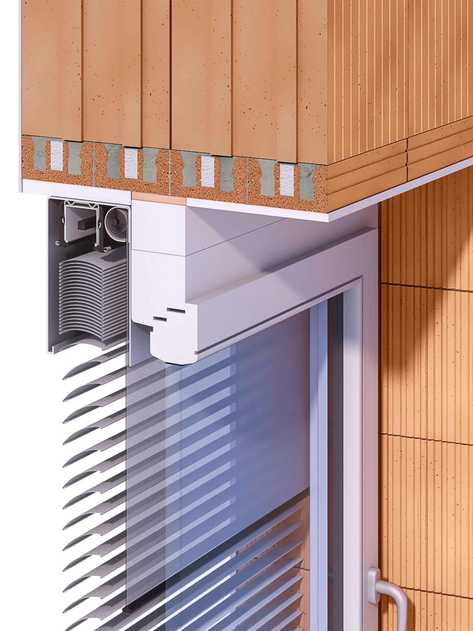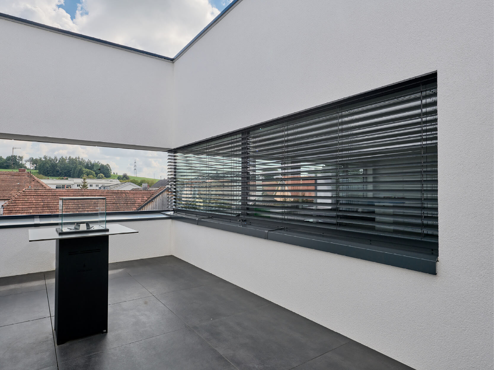 Je nach baulicher Gegebenheit gibt es Raffstores als Vorbaulösung oder mit Unterputzkasten, der vollständig in die Fassade integriert wird.