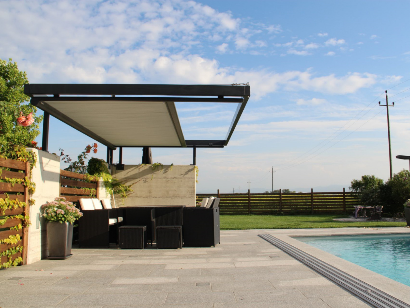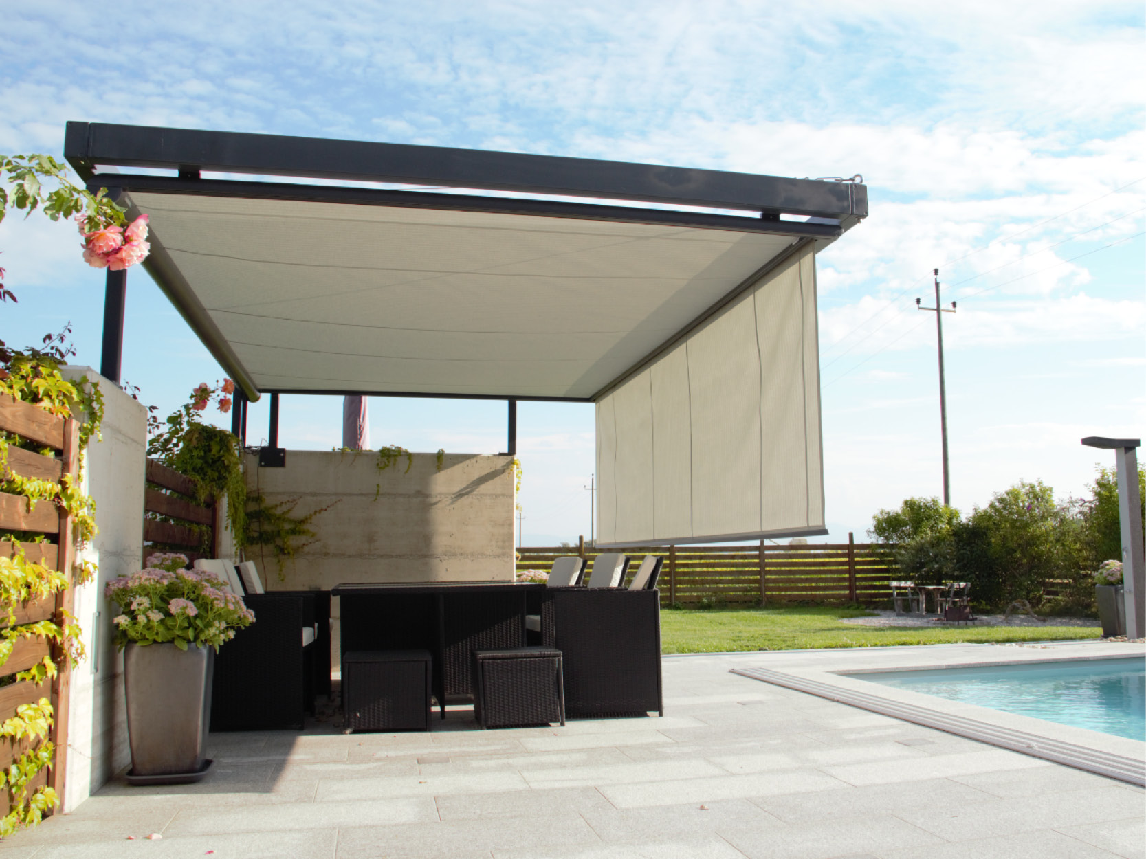 Verbaute Produkte: Markilux Pergola 6 x 4,5 Meter | Gestellfarbe: RAL 9006 weißaluminium | Tuchdessin: 31208 sunvas | Bedienung: Motor
