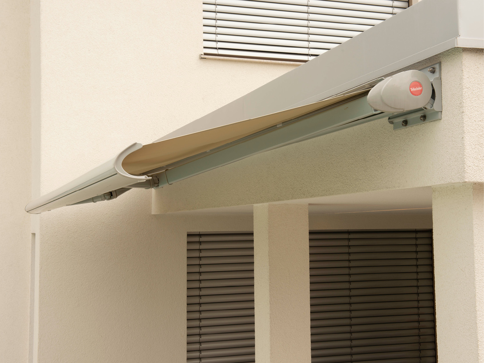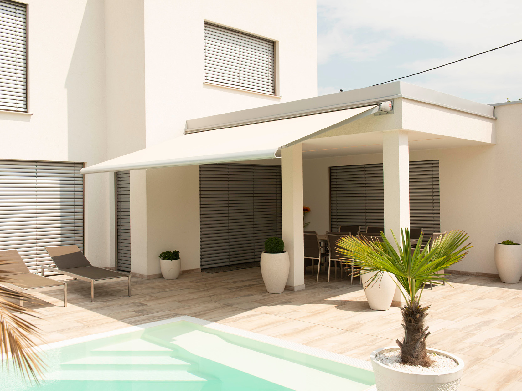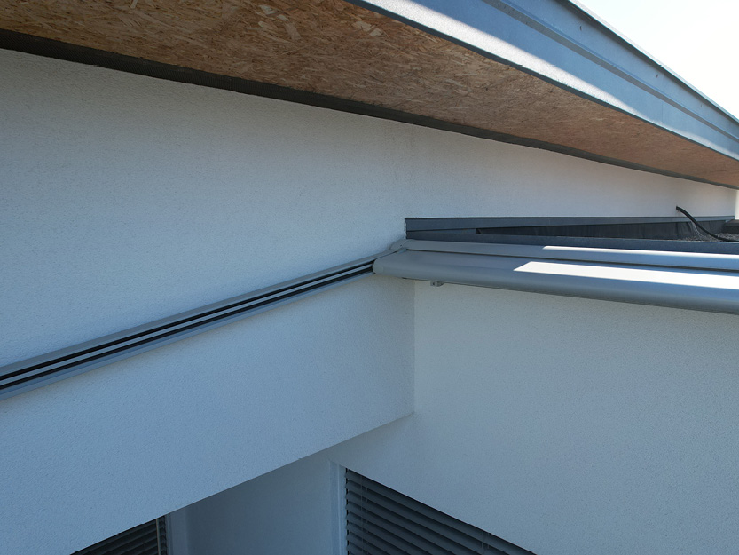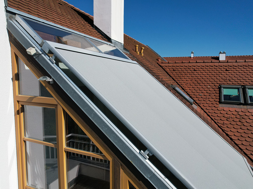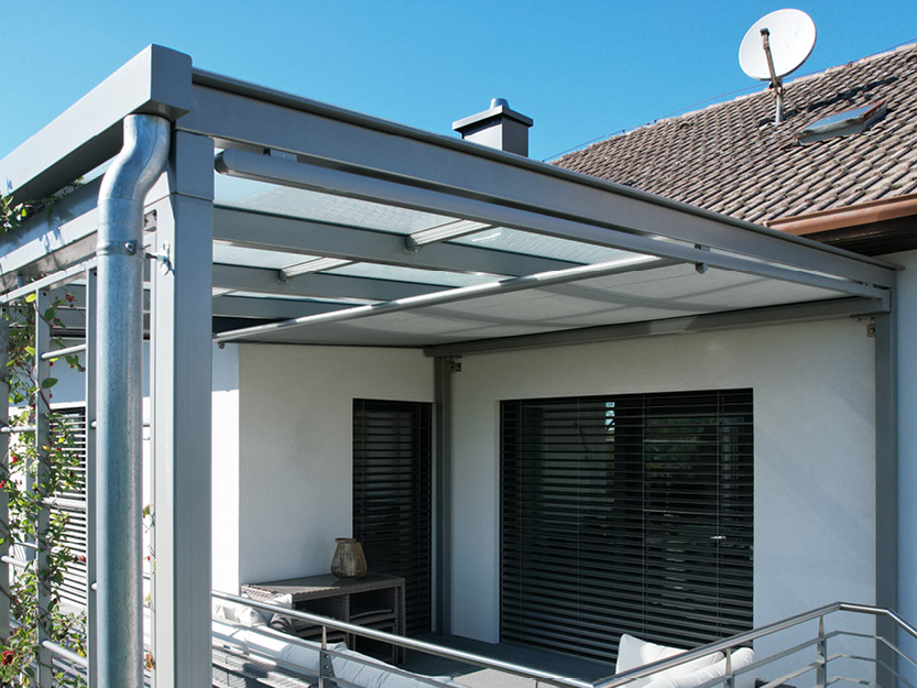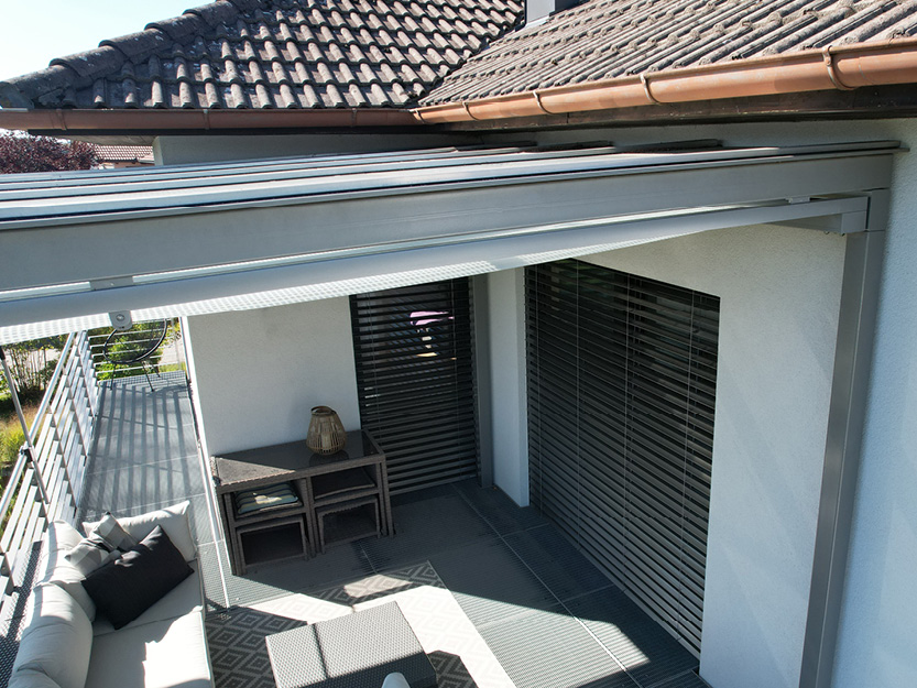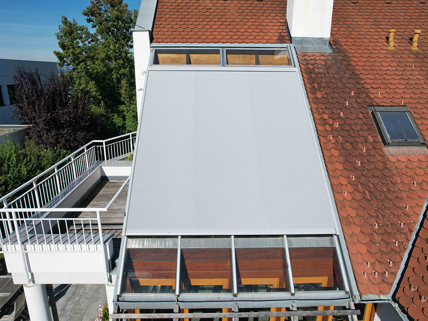 Verbaute Produkte: Aufglasmarkise Markilux 770 tracfix | Gestellfarbe: RAL 9006 Weißaluminium | Tuchdessin: 33218 perfotex | Bedienung: Motor | Sonnen- und Windwächter