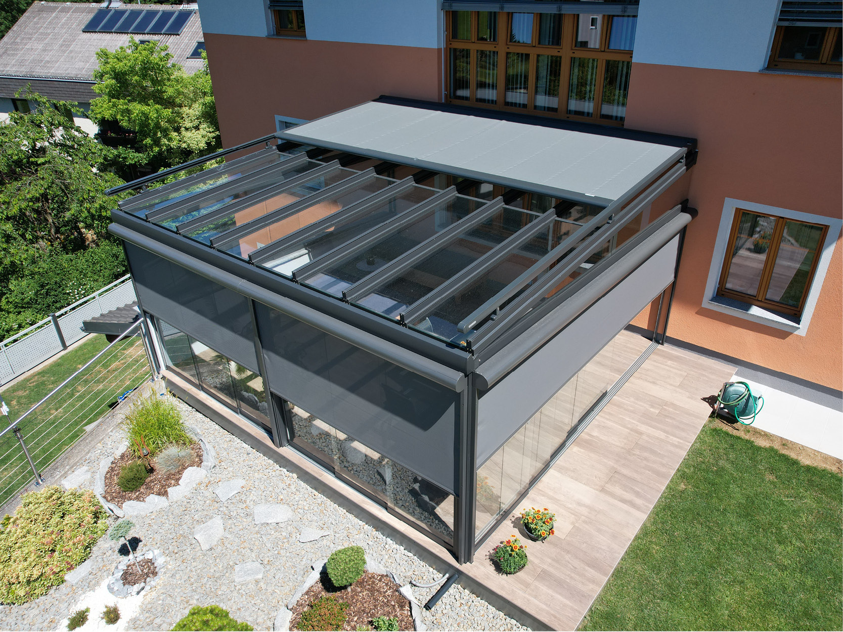 Verbaute Produkte: Aufglasmarkise 770 tracfix Koppelanlage mit Funkmotor | Tuchdessin 5204 | Tritscheler Glasdach 8 x 3,4 m | Gestellfarbe: SL 94 | Glas-Schiebeelemente 3 Spurig, 3 Flügel | Dreiecksverglasung