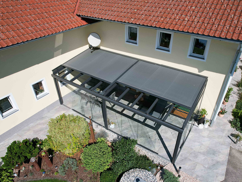 Verbaute Produkte: Tritscheler Glasdach 5,4 x 4,8 m | Glas-Schiebeelemente an allen Seiten | Aufglasmarkise 8800 | Vertikalmarkise an allen Seiten | LED-Streifen | Heizstrahler mit Funkdimmer und Handsender