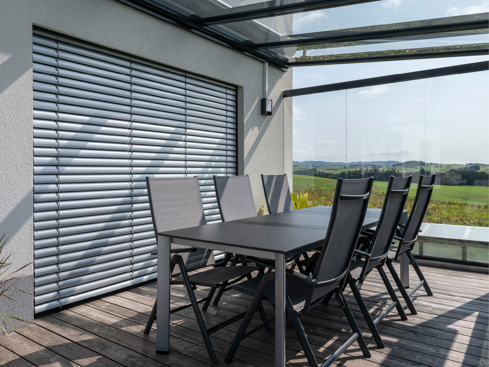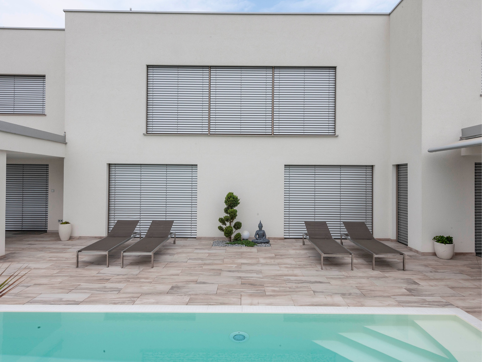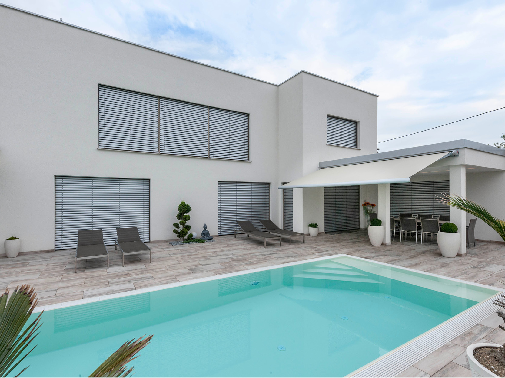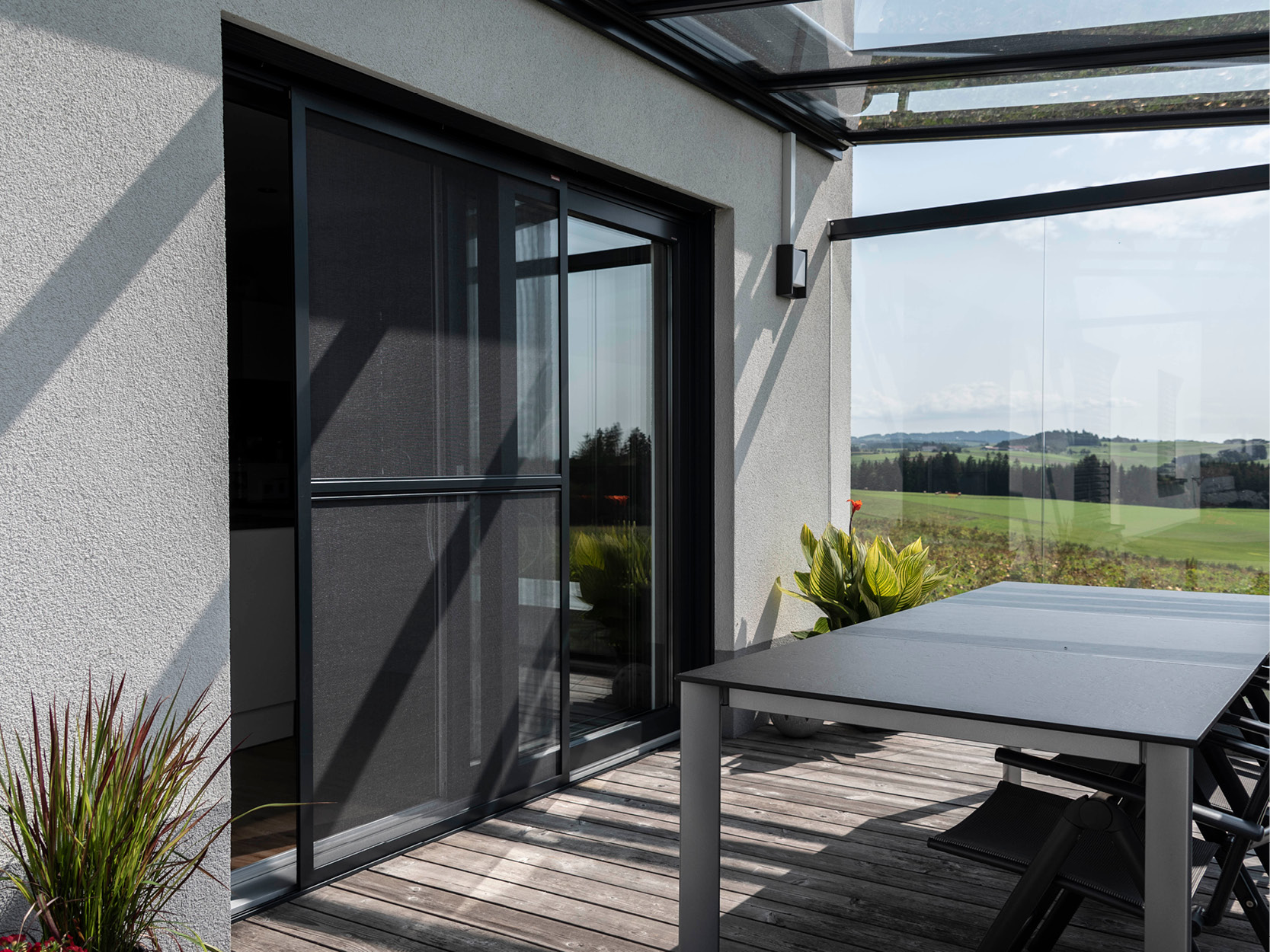 Verbaute Produkte: Raffstore 80 gebördelt in weißaluminium | Führungsschienen Raffstore: UPS3 in RAL 9016 weiß, VL3 mit Halter in RAL 9007 graualuminium, VL2 mit Halter in RAL 9007 graualuminium | Endleistenfarbe: RAL 9007 graualuminium | Insektengitter Spannrahmen | Insektengitter Schiebetür | Insektengitter Drehtür | Pergola 6 x 4,5 Meter