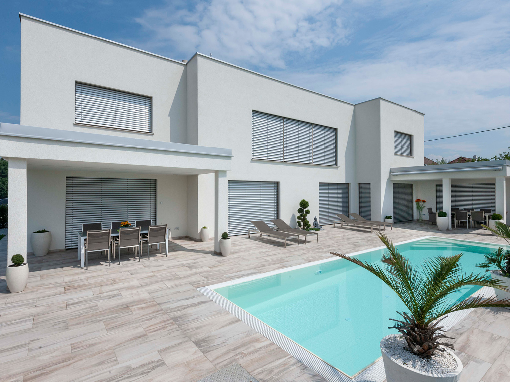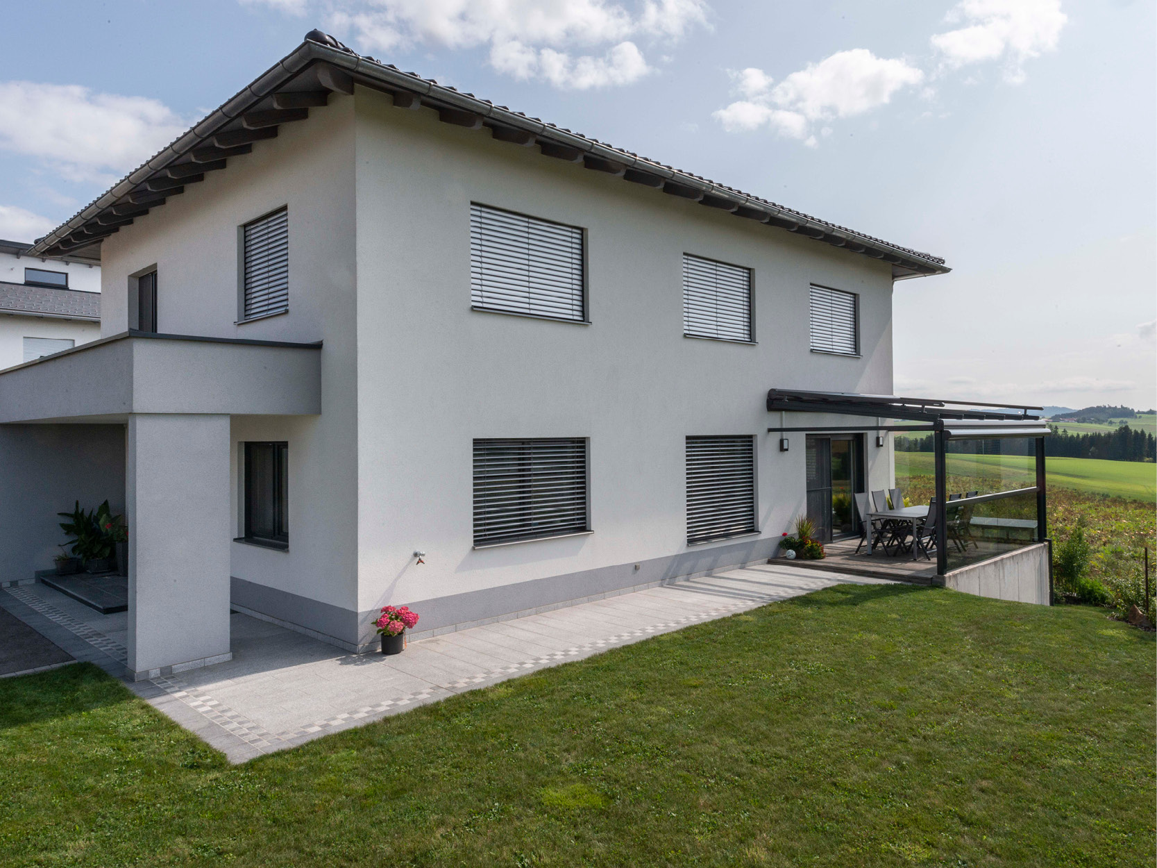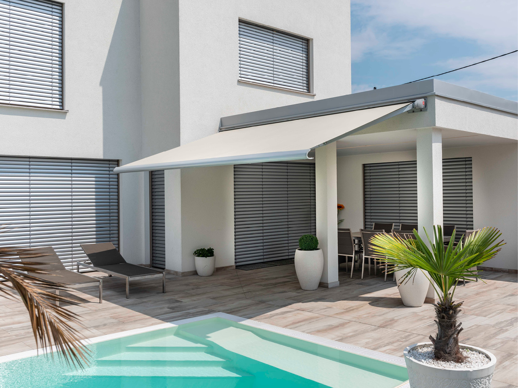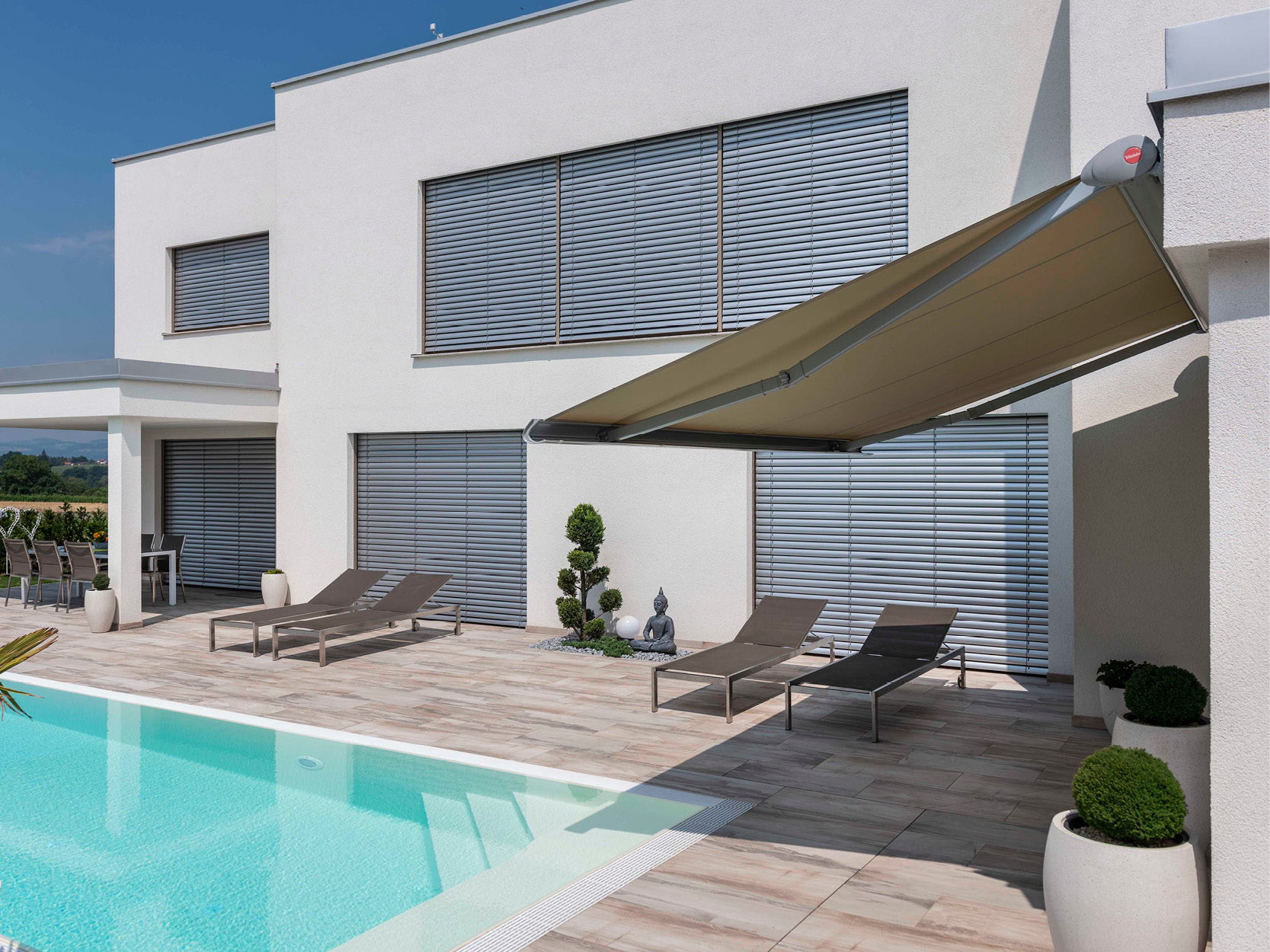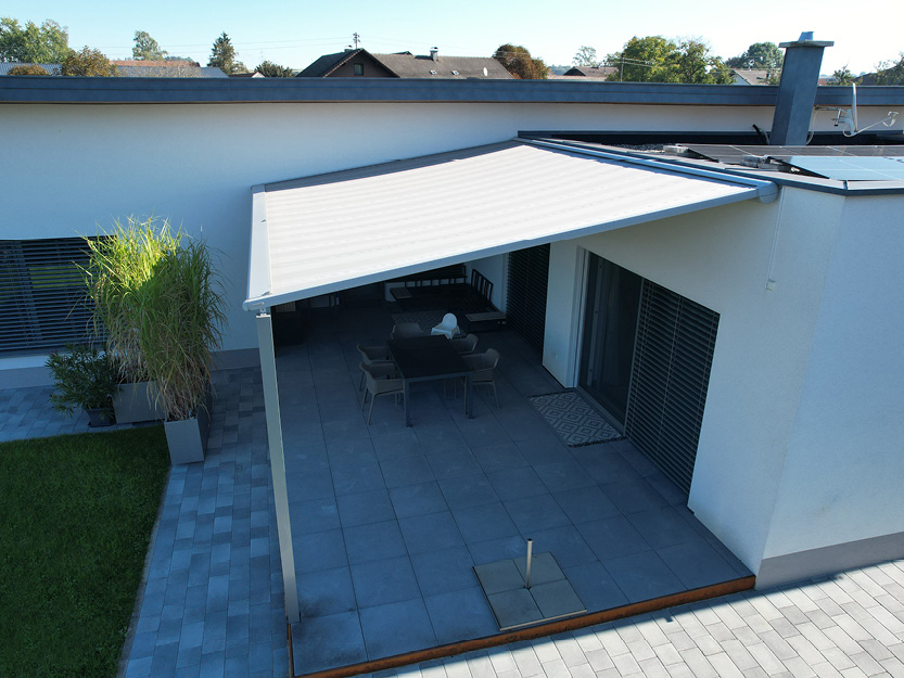 Verbaute Produkte: Raffstore 80 gebördelt in weißaluminium | Führungsschienen Raffstore: UPS3 in RAL 9016 weiß, VL3 mit Halter in RAL 9007 graualuminium, VL2 mit Halter in RAL 9007 graualuminium | Endleistenfarbe: RAL 9007 graualuminium | Insektengitter Spannrahmen | Insektengitter Schiebetür | Insektengitter Drehtür | Pergola 6 x 4,5 Meter