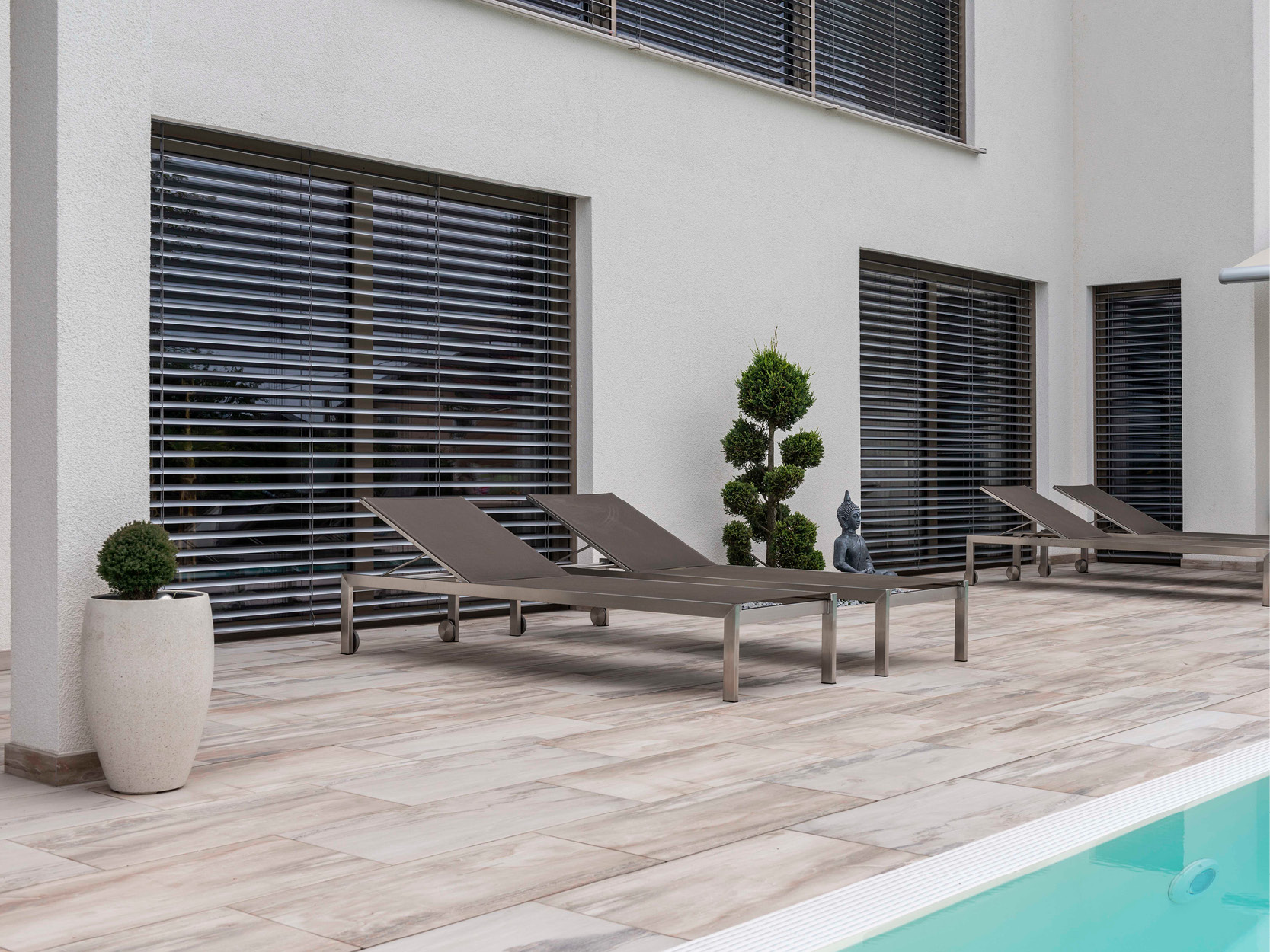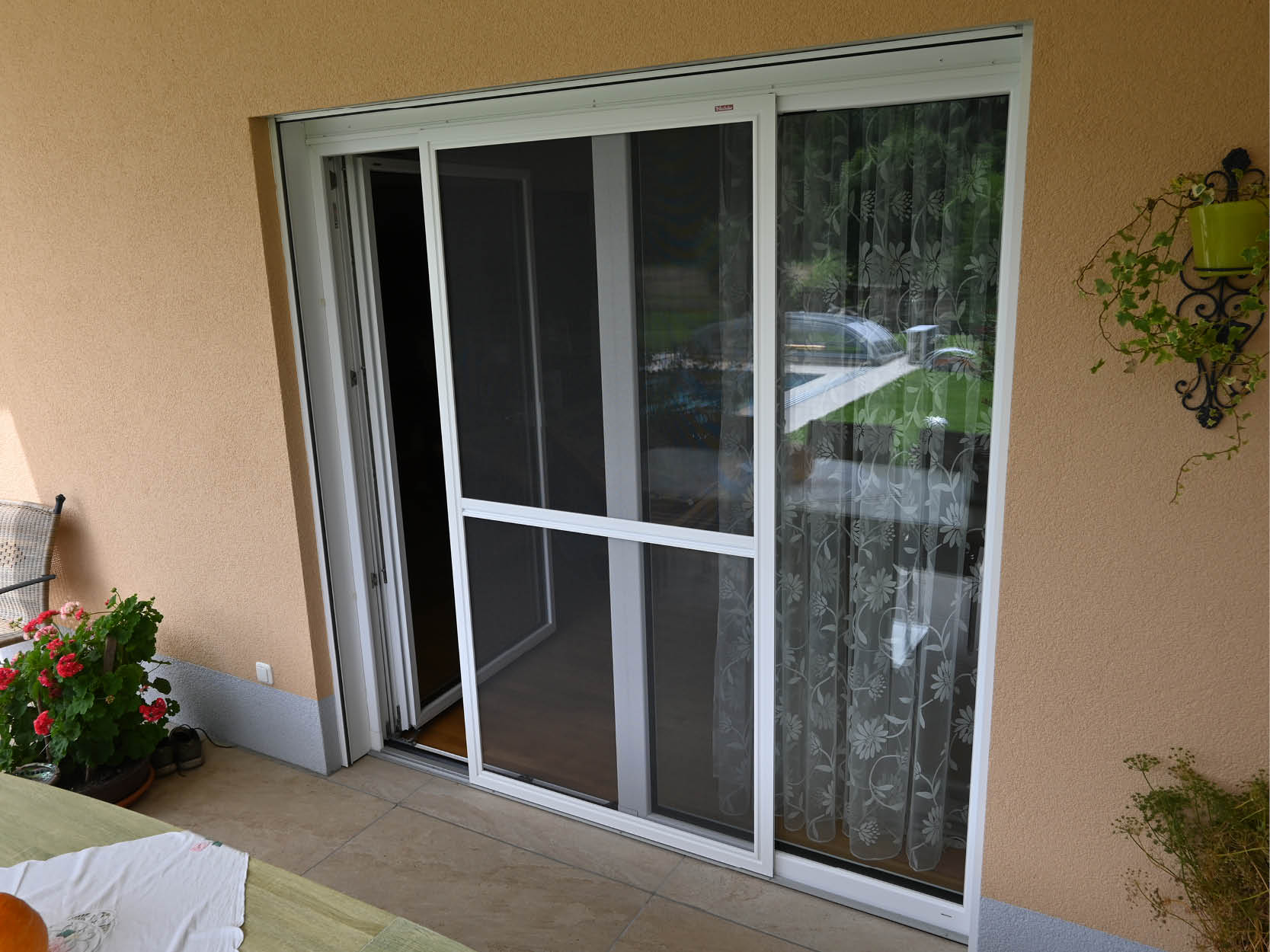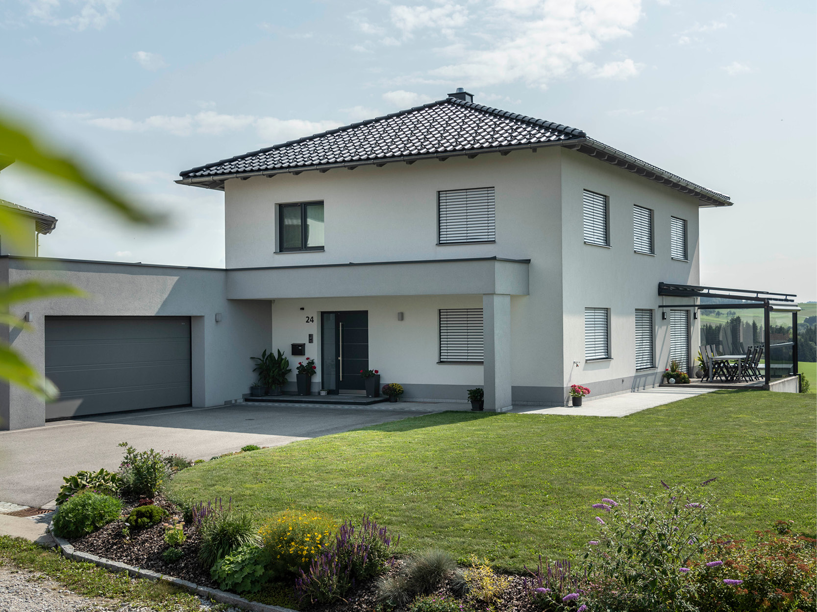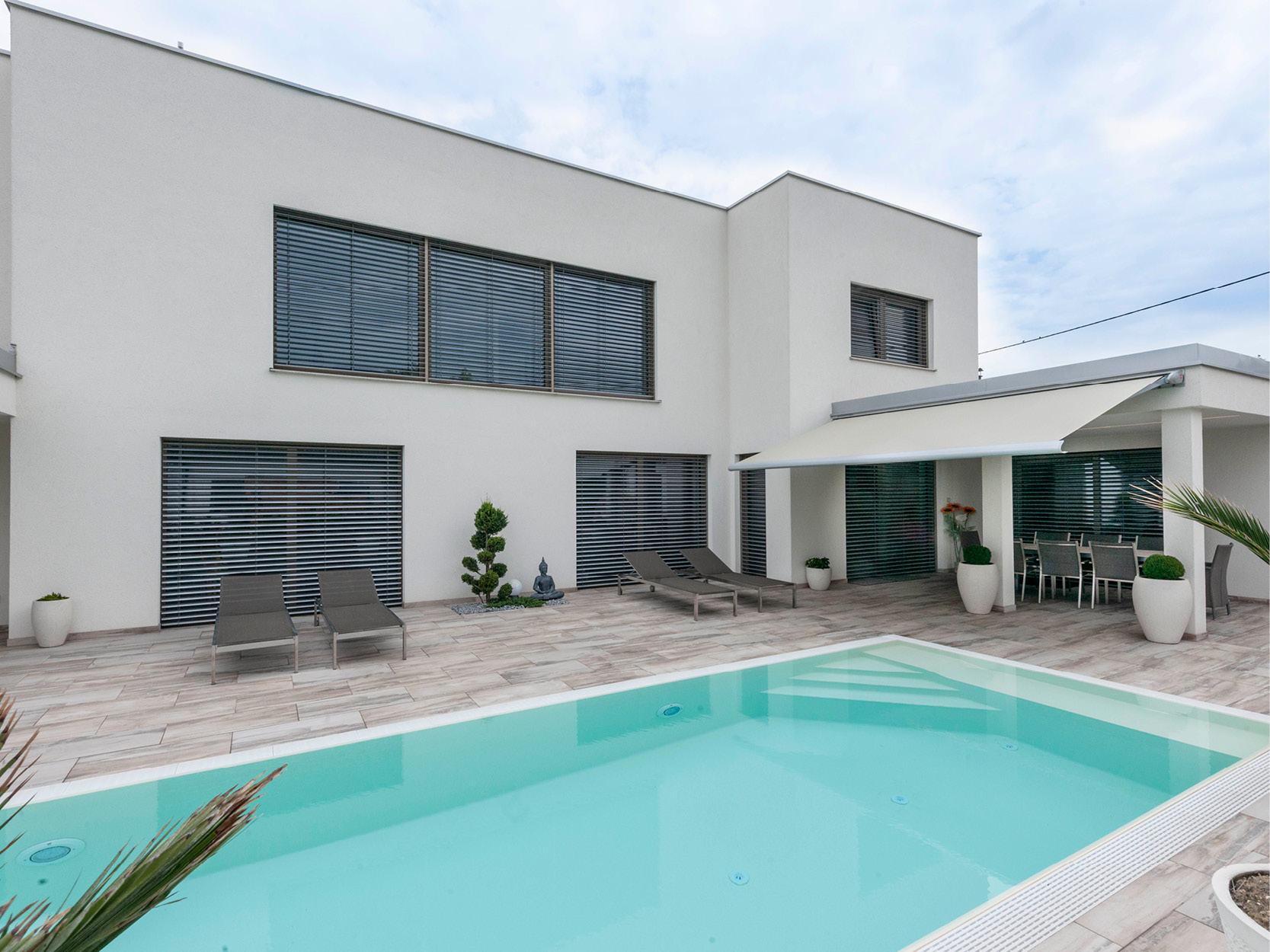 Verbaute Produkte: Raffstore 80 gebördelt in weißaluminium | Führungsschienen Raffstore: UPS3 in RAL 9016 weiß, VL3 mit Halter in RAL 9007 graualuminium, VL2 mit Halter in RAL 9007 graualuminium | Endleistenfarbe: RAL 9007 graualuminium | Insektengitter Spannrahmen | Insektengitter Schiebetür | Insektengitter Drehtür | Pergola 6 x 4,5 Meter