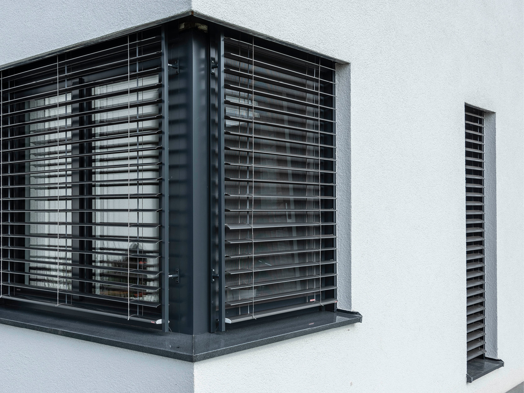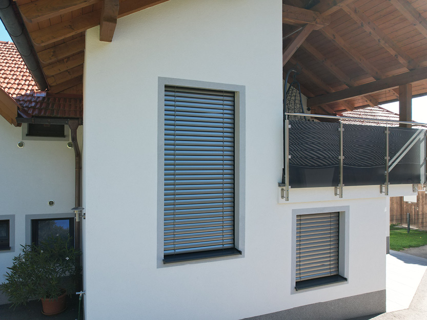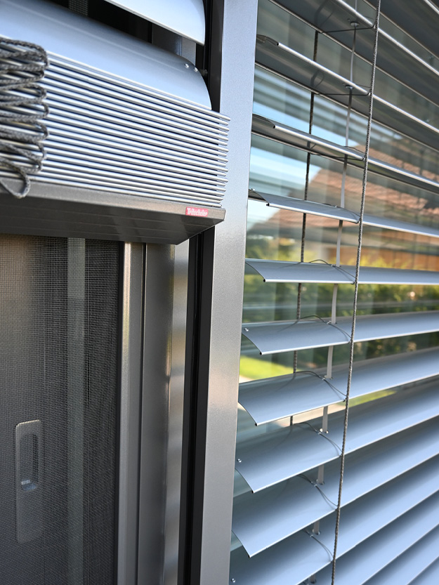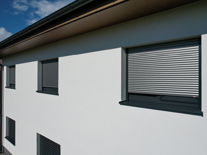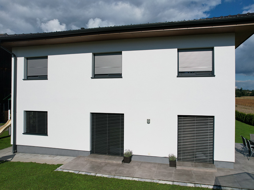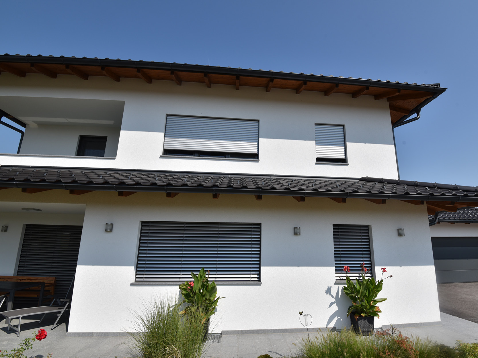 Verbaute Produkte: Raffstore 80 gebördelt in graualuminium | Rollläden Alu M317 ausgeschäumt in RAL 9007 graualuminium| Führungsschienen Raffstore: VL 2 mit Abstandhalter in RAL 7016m anthrazitgrau | Führungsschienen Rollladen: A20 und A3 in RAL 7016m anthrazitgrau | Endleistenfarbe: RAL 9007 graualuminium | Insektengitter Spannrahmen | Insektengitter-Rollo