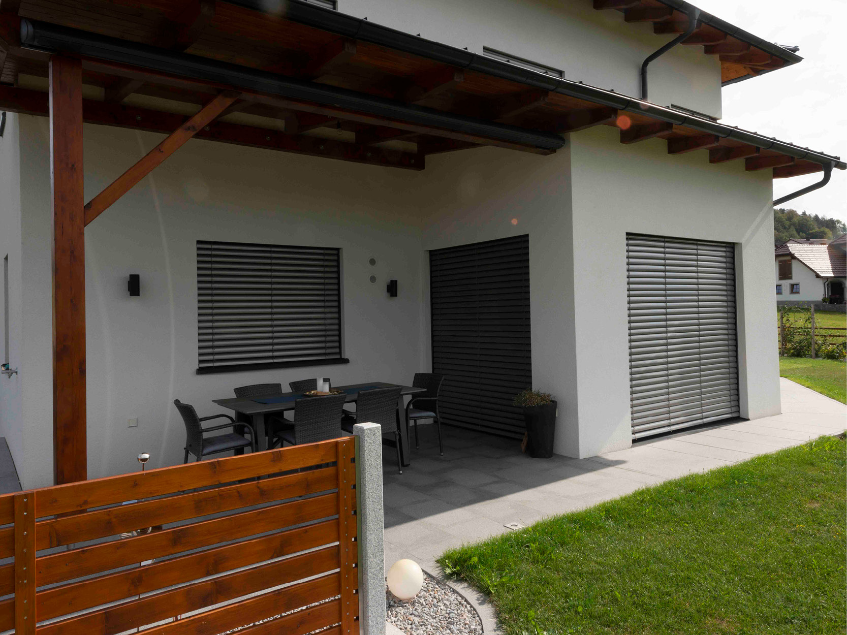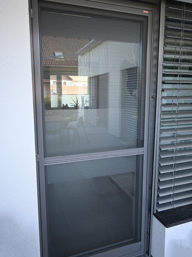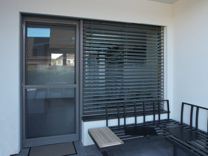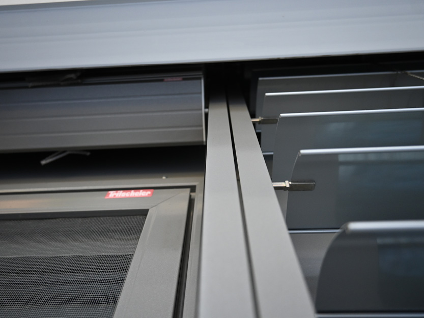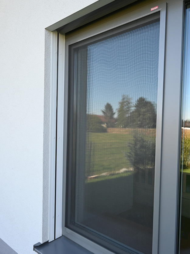 Verbaute Produkte: Thermoton Ziegel-Rollladenkasten Mauerstärke 50 cm | Raffstore gebördelte Lamellen 80 mm 7016 anthrazitgrau | Rollladen Alu ausgeschäumt M521 anthrazitgrau | Insektengitter Schiebeelemente, Drehtür selbstschließend und Spannrahmen