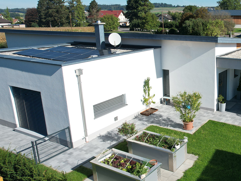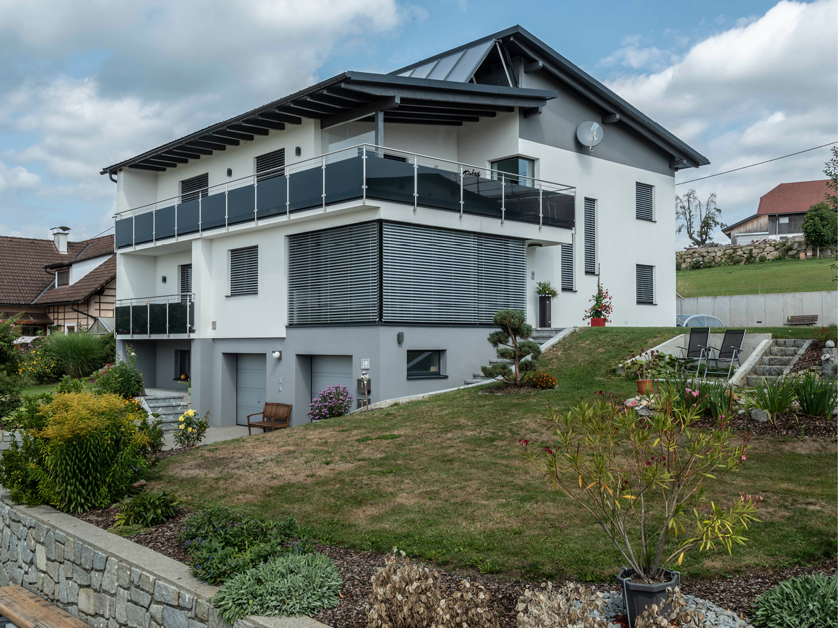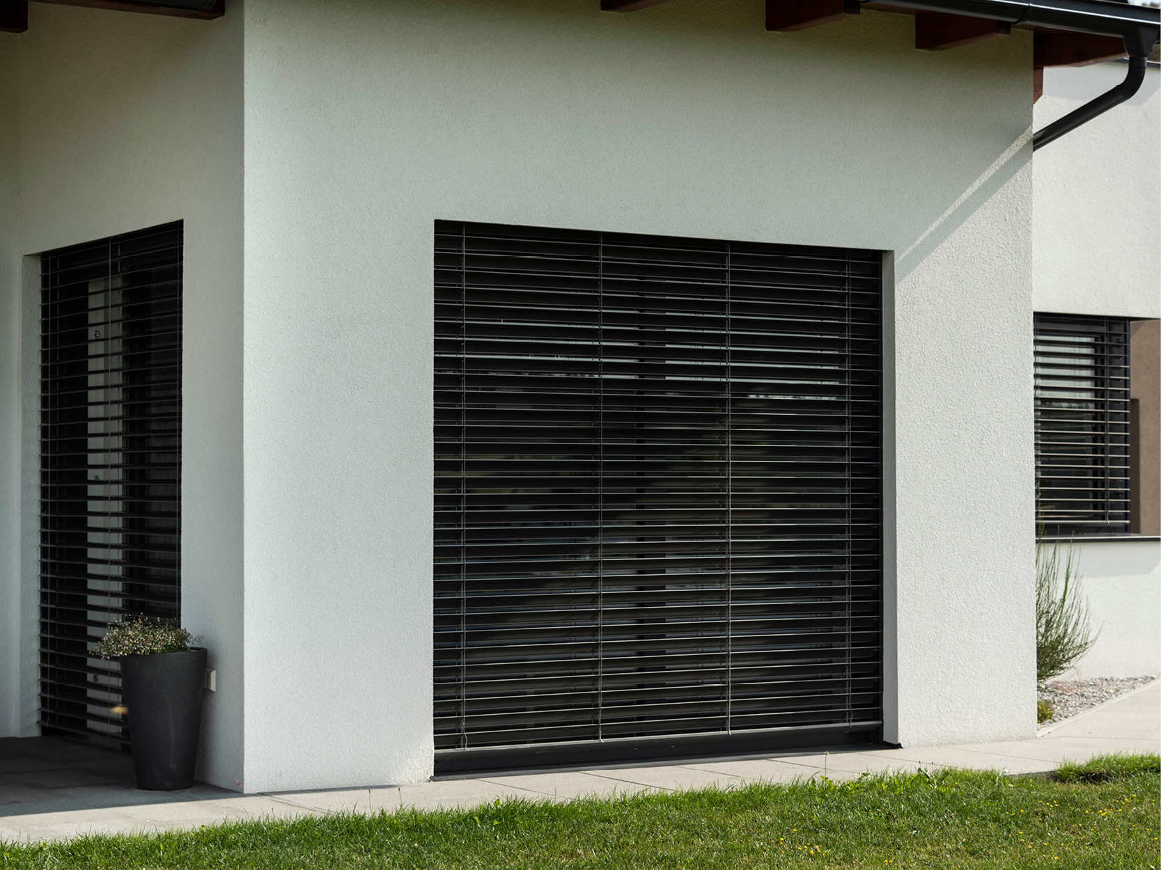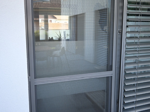 Verbaute Produkte: Thermoton Ziegel-Rollladenkasten Mauerstärke 50 cm | Raffstore gebördelte Lamellen 80 mm 7016 anthrazitgrau | Rollladen Alu ausgeschäumt M521 anthrazitgrau | Insektengitter Schiebeelemente, Drehtür selbstschließend und Spannrahmen