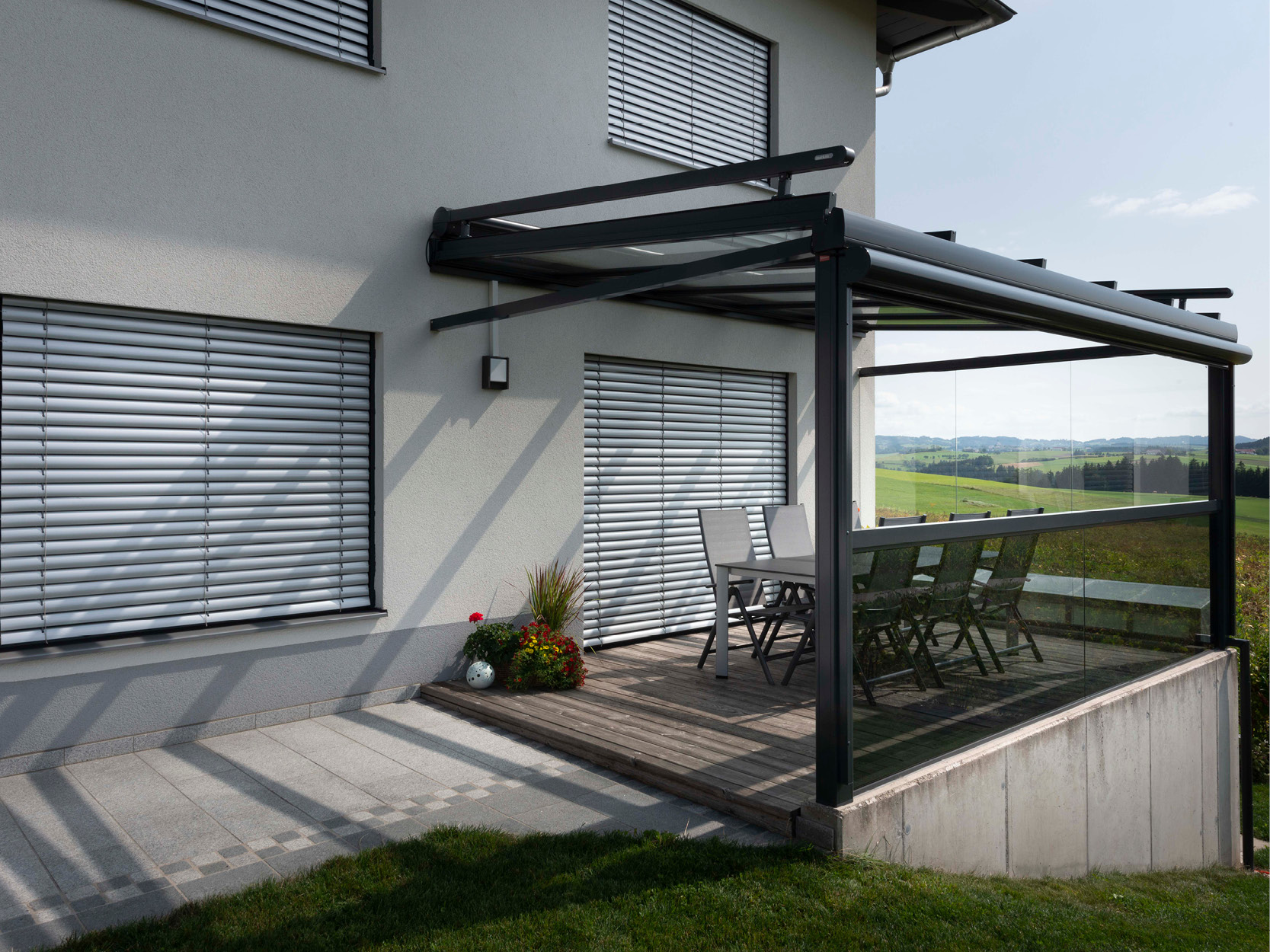 Ziegel-Rollladenkästen mit Sonnenschutz und Glasdach mit Beschattung, Bezirk Rohrbach