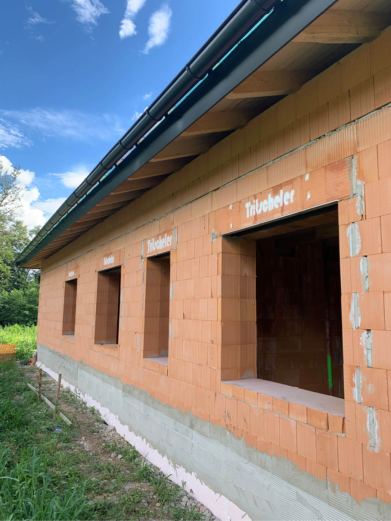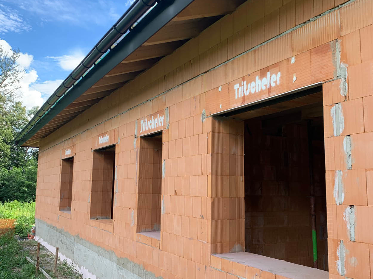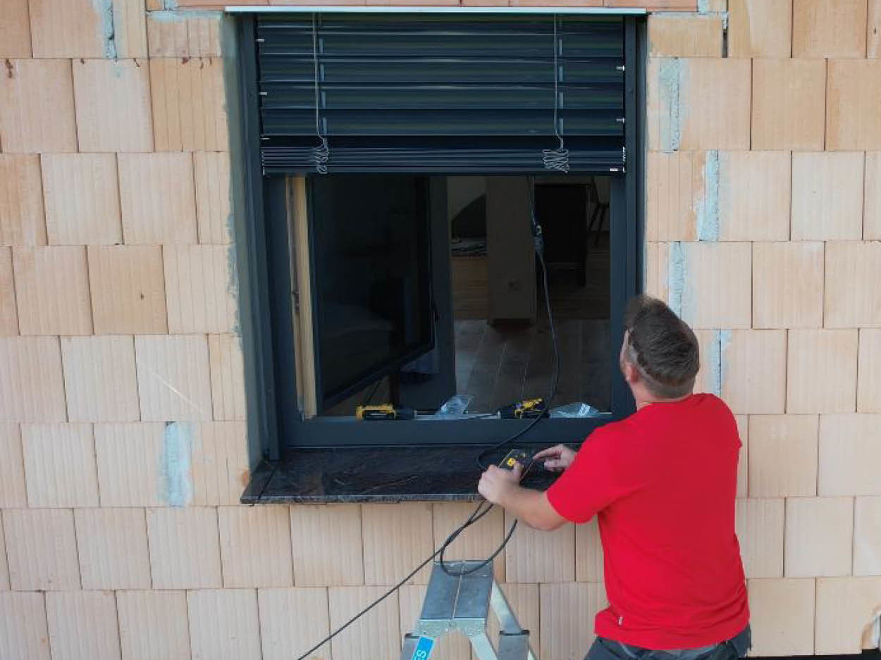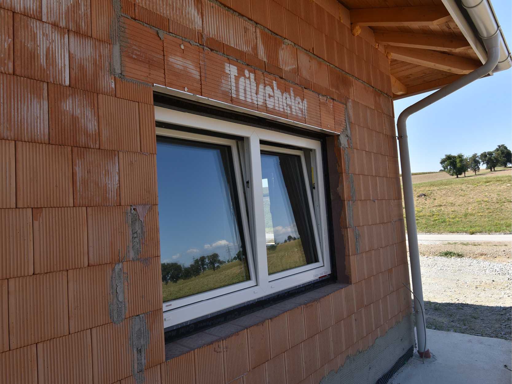 Verbaute Produkte: Thermoton Ziegel-Rollladenkasten Mauerstärke 50 cm | Raffstore Lamellen gebördelt 80 mm weißaluminium | Rollladen Alu ausgeschäumt naturell | Insektengitter