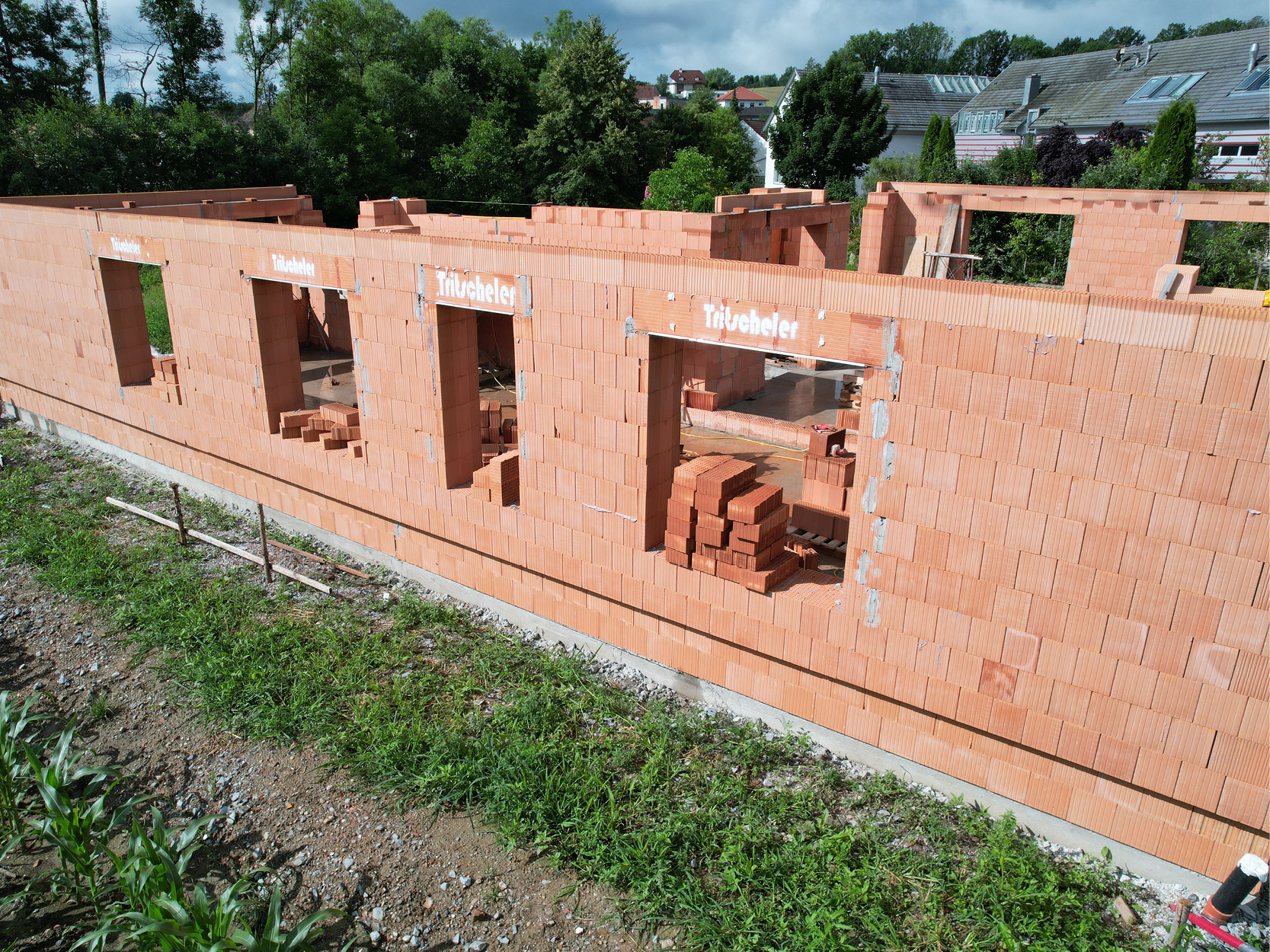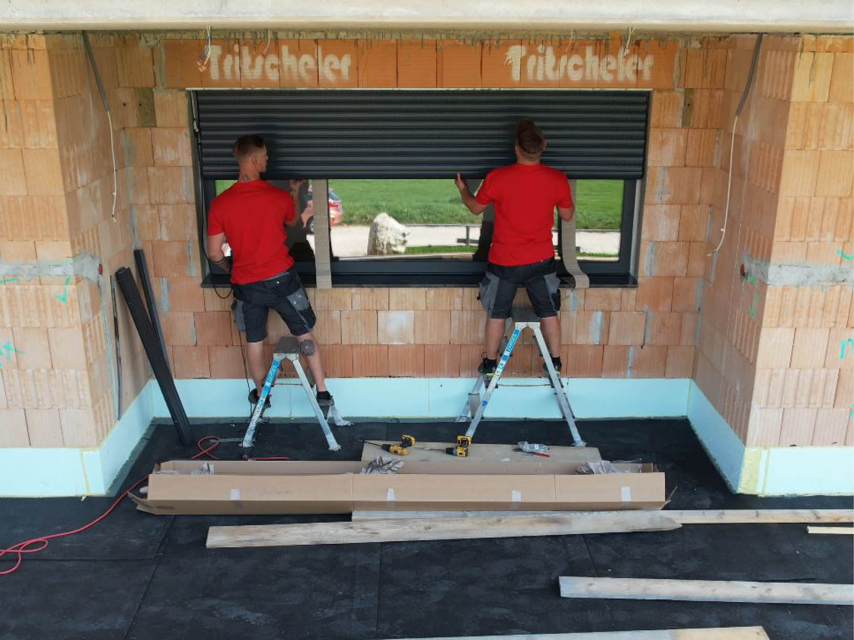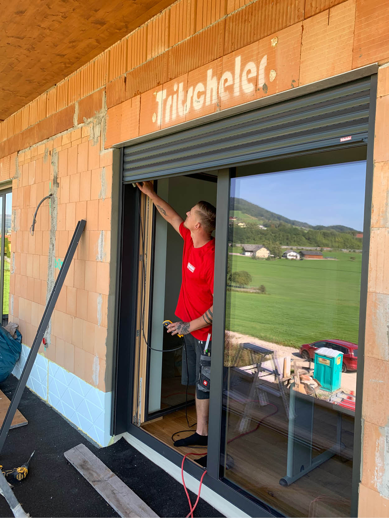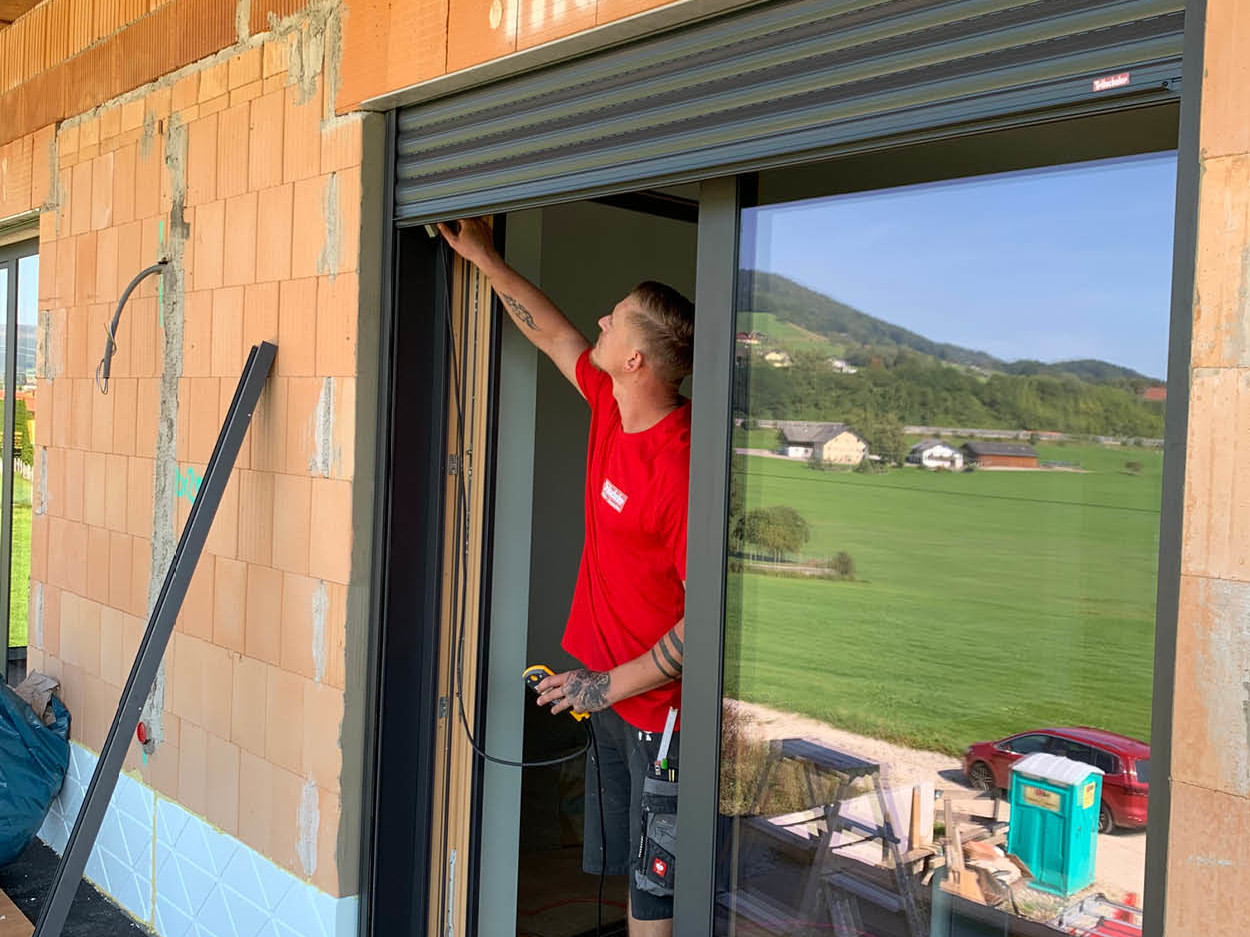 Verbaute Produkte: Thermoton Ziegel-Rollladenkasten Mauerstärke 50 cm | Raffstore Lamellen gebördelt 80 mm weißaluminium | Rollladen Alu ausgeschäumt naturell | Insektengitter