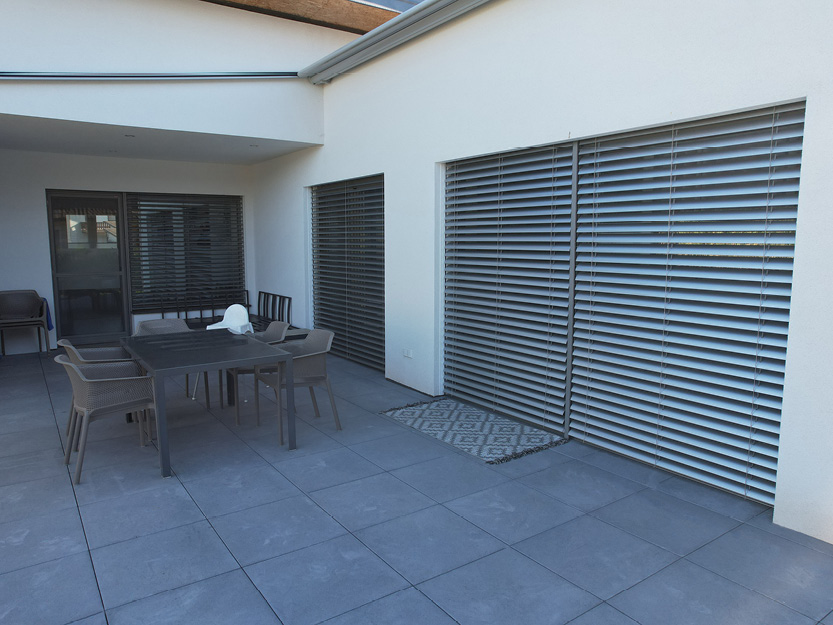 Verbaute Produkte: Thermoton Ziegel-Rollladenkasten 50 cm, mit Raffstore 80 gebördelt in graualuminium, Schiene und Endleiste RAL 7016m | Unterputzkasten mit Rollladen M317 Alu ausgeschäumt in graualuminium, Schiene und Endleiste RAL 7016m, integriertes Insektengitter-Rollo | Vertikalmarkisen (ZipTex), Stoff: Satine 0706