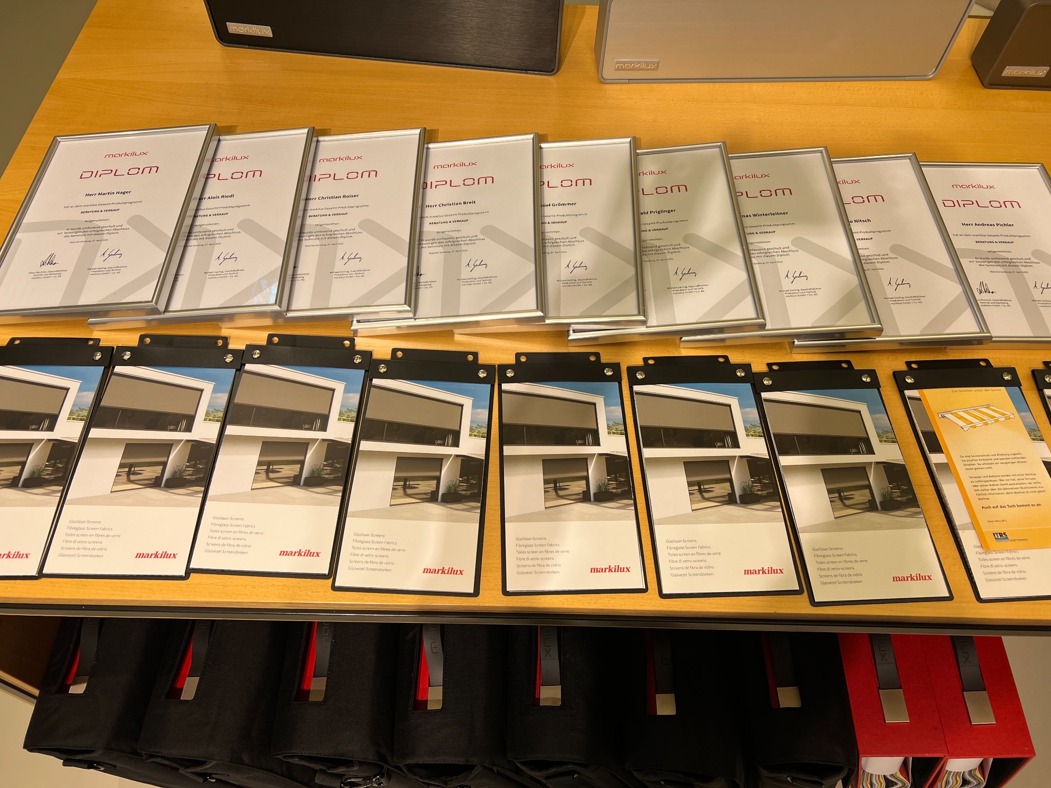 Regelmäßige Produktschulungen und Verkaufstrainings sind wichtige Grundsteine für unsere Fachberater. Deshalb war unser gesamtes Verkaufsteam und unsere Techniker letzte Woche zu Gast bei unserem Geschäftspartner Markilux in Salzburg. Es wurden Produktneuheiten und neue Stoffkollektionen vorgestellt, Umsatzstarke Produkte wurden intensiviert und der Umgang mit digitalen Hilfsmittel vorgestellt. Anschließend ließ man den Tag bei einem gemeinsamen Abendessen und netten Gesprächen ausklingen.